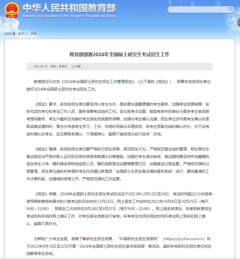 教育部近期印發《2024年全國碩士研究生招生工作管理規定》(以下簡稱《規定》),部署各地各招生單位實行2024年全國碩士研究生考試招生工作。